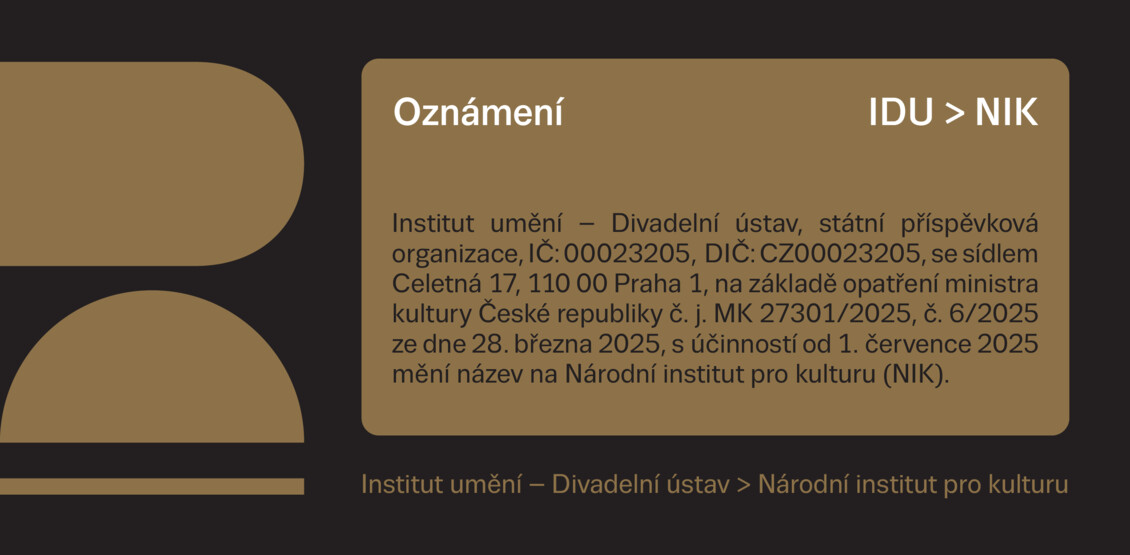 Institut umění – Divadelní ústav, státní příspěvková organizace pod kterou spadá také činnost CzechMobility.Info, IČ: 00023205, DIČ: CZ00023205, se sídlem Celetná 17, 110 00 Praha 1, tímto oznamuje, že na základě opatření ministra kultury České republiky č. j. MK 27301/2025, č. 6/2025 ze dne 28. března 2025, se s účinností od 1. července 2025 mění název Institutu umění – Divadelního ústavu, který po změně zní: Národní institut pro kulturu (zkratka NIK). Ostatní identifikační údaje státní příspěvkové organizace zůstávají beze změny.